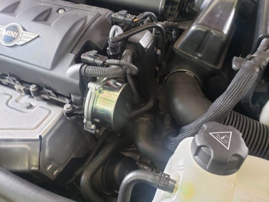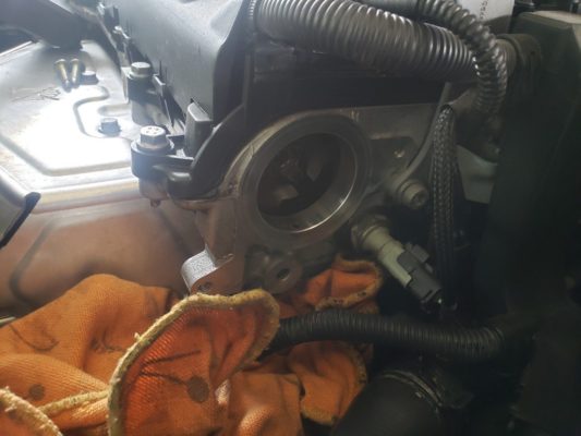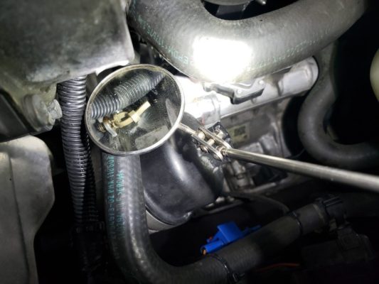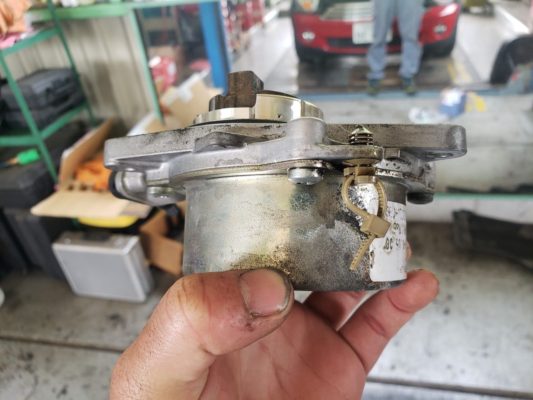 エンジンの真ん中にオイルが溜まっていて、バキュームポンプからオイルが濡れているのを確認し漏れがエンジン側・バキュームポンプ本体どちらかを確認のため清掃。 → 暖機・試乗を繰り返して漏れ箇所の確認。