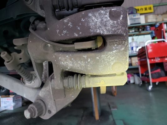 ブレーキパット残量が少ないです、左右パットは均等に摩耗していてセンサーも付いているので警告灯でわかりますが、早めの交換をオススメします。