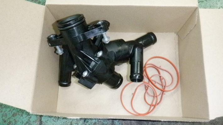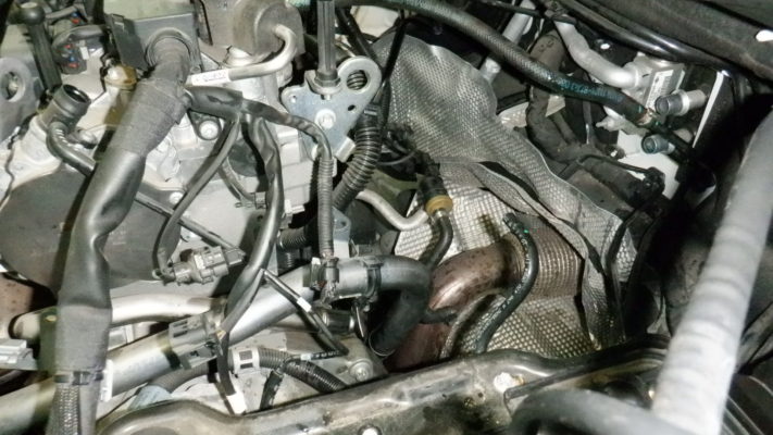 サーモスタットはエンジン後方、インマニ下に付いています。