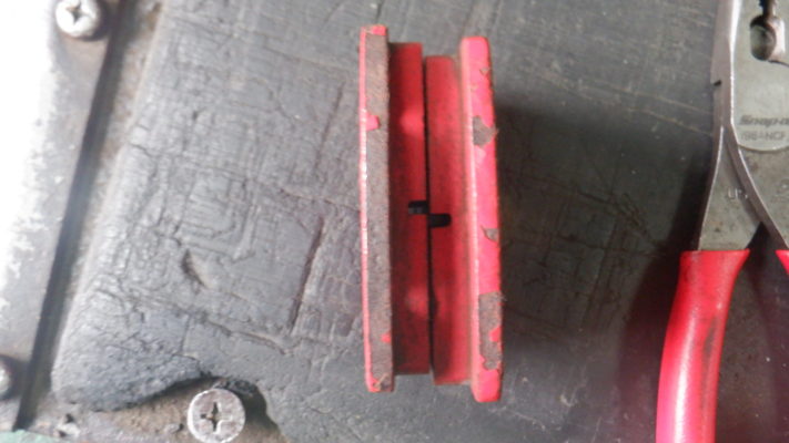↑フロントブレーキパッド残量、7.0mm。 清掃し鳴き止めグリスを塗布し組付け。