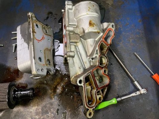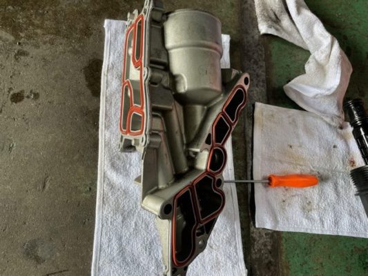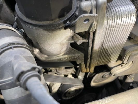 ↑オイルエレメントハウジング付近からのオイル漏れ。