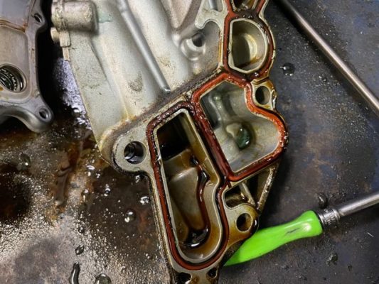 ↑オイルパンを清掃し、オイルパンのガスケットを交換。