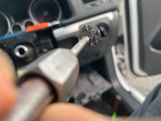 ステアリングのロックを交換しますが、ドリルでセンターに穴を開け、