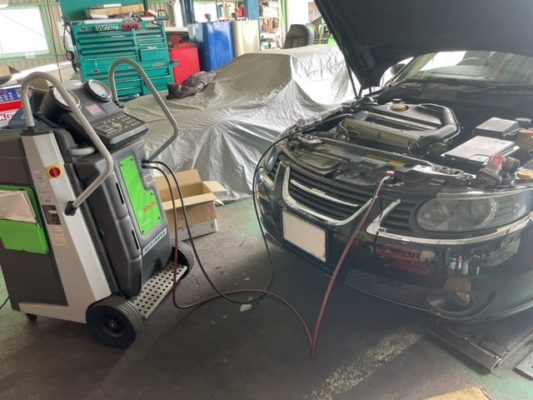 K様、サーブ9-5、オイルとエレメント交換と、エアコンガス入れ替え。