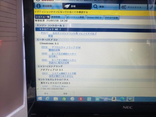 診断機を接続して点検すると、エンジンマウントのエラーが消去できないのが気になりました。