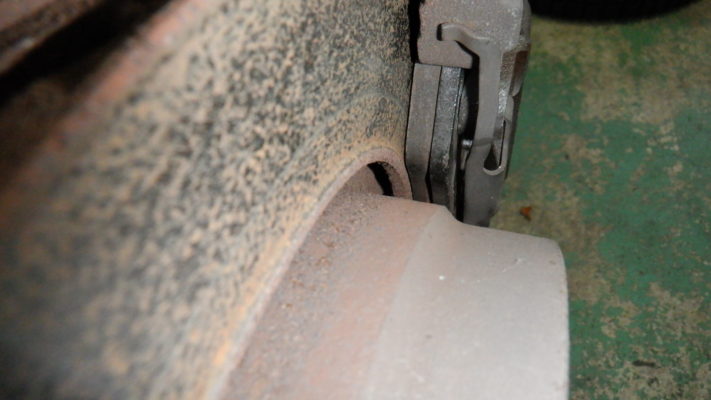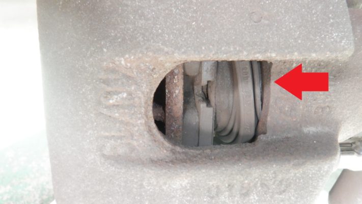 前後ブレーキキャリパーのダストブーツ(矢印部分)がめくれていました。