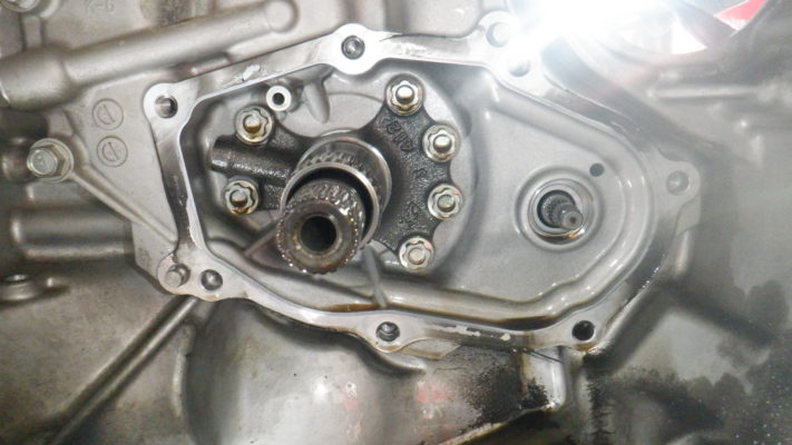 点検の結果、ミッションのオイルポンプからの漏れと判断しました。