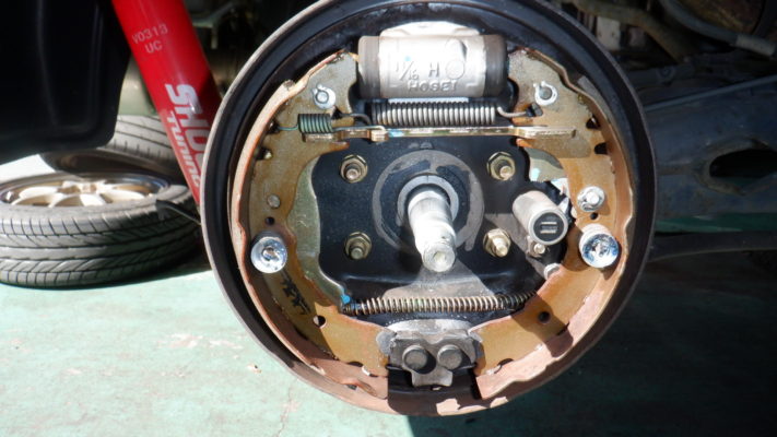 ↑リアはブレーキシュー残量と、ホイルシリンダーからのフルード漏れもなく良好。