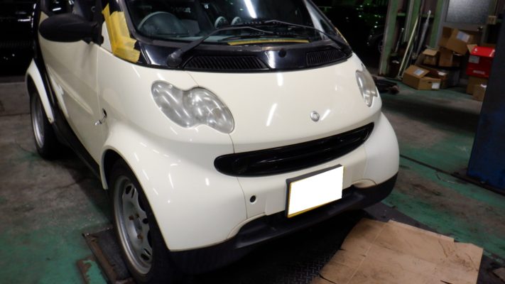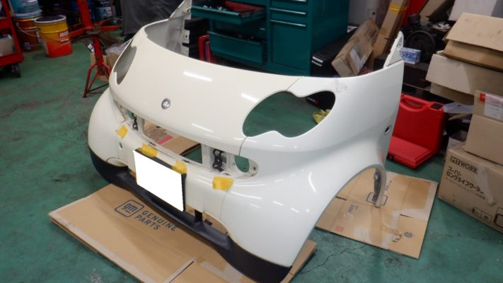交換にはフロント周りのバンパー・ヘッドライトなどを取り外して作業です