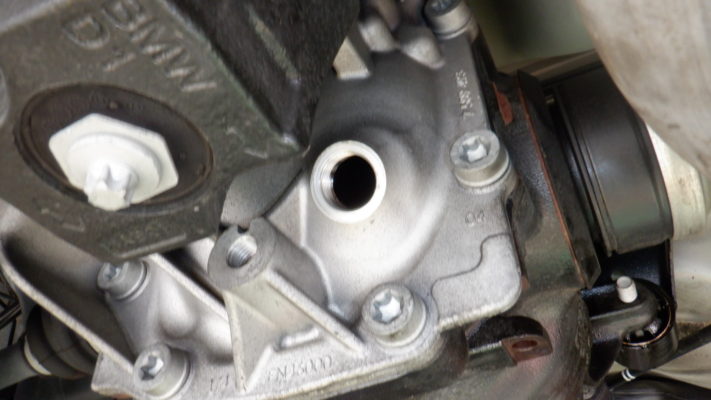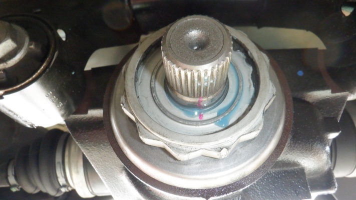 プロペラシャフトを抜いて写真の12角ナットを取り外すとオイルシールが見えます。