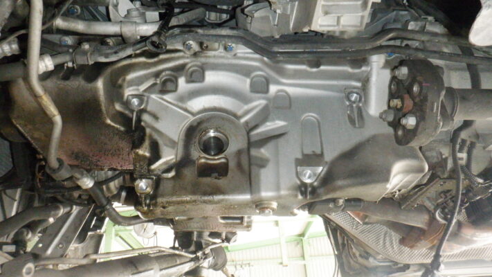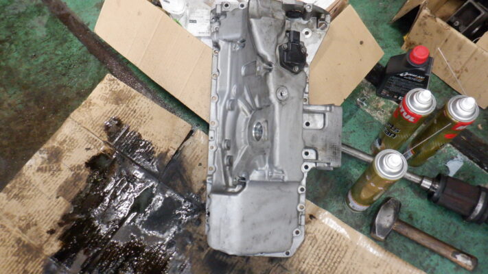 フロントデフを取り外してようやくオイルパンが外せる状態になります。
