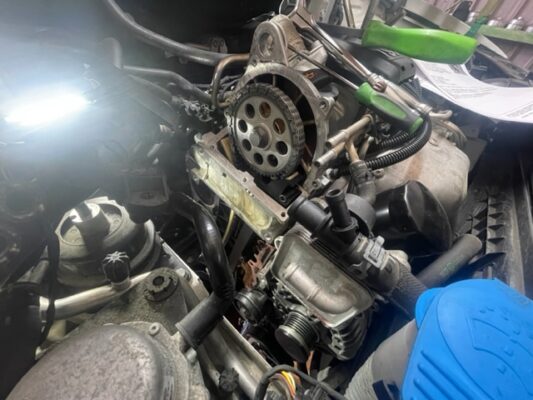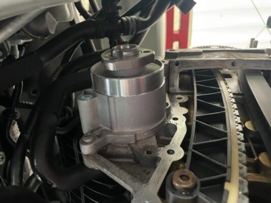 ↑タイミングチェーンからの異音のため、工具をセットし作業を進めます。