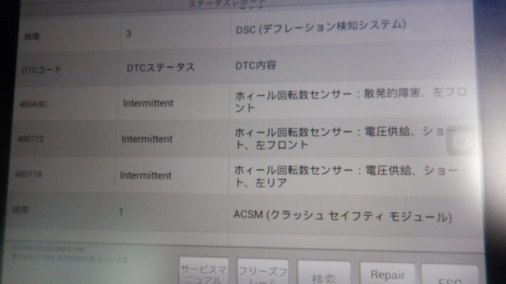 故障コードを読み出すと左前後のABSセンサーのエラーが入力されていました。