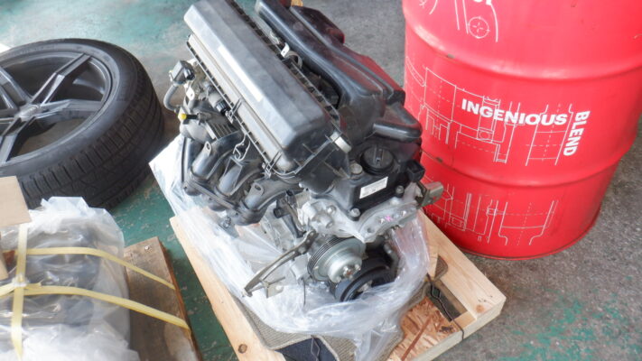 配線周り・ホース周り・エンジンマウントを外して前後にずらしながら車体から外しました
