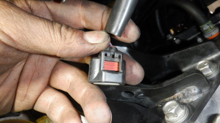逆の手順でエンジンとミッションを車体に戻していきます、配線のコネクターが破損しているのでタイラップとビニールテープで固定しました。