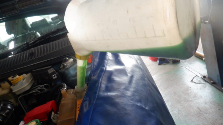 ホースを繋ぎ、新しい冷却水を注入しました。