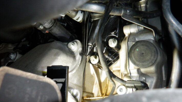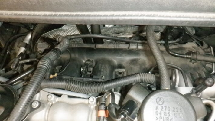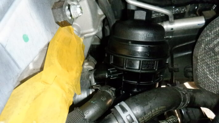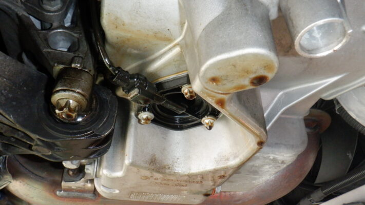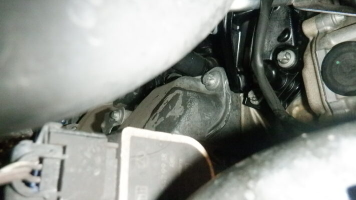 エンジン下回りがオイルで濡れています、上からのオイルが落ちてきているので上から順番に修理していきます。