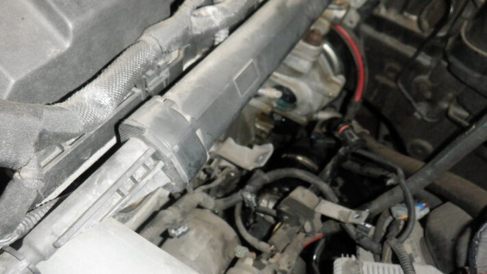 矢印の所に水滴が付着しているので、ウォーターポンプとサーモスタットを繋ぐパイプの交換となりました。