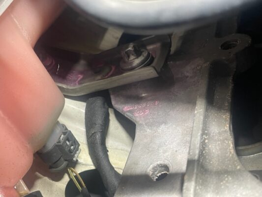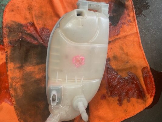 ↑ラジエターサブタンクの裏側に漏れている形跡があり、