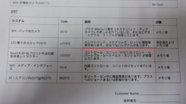 エラーを読み出すとステアリングロックのエラーが入力されていました。
