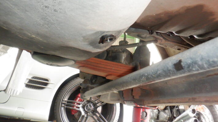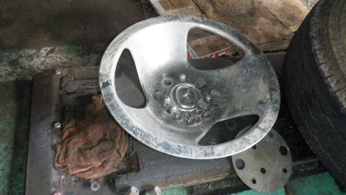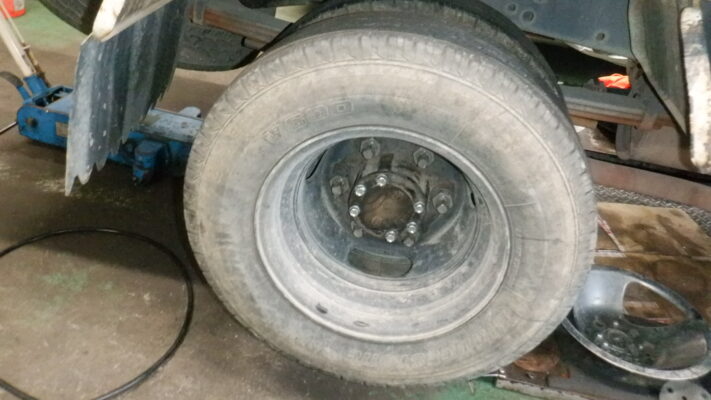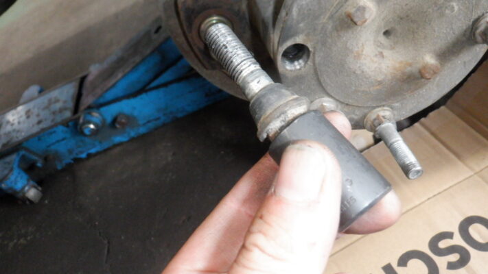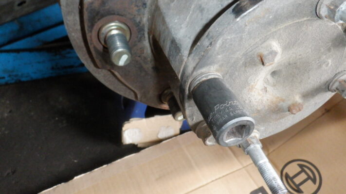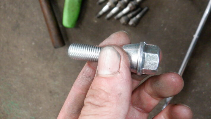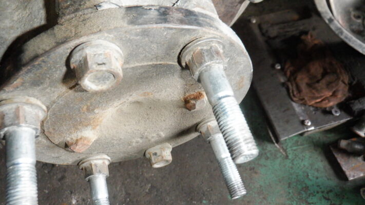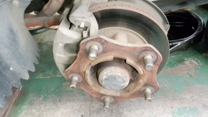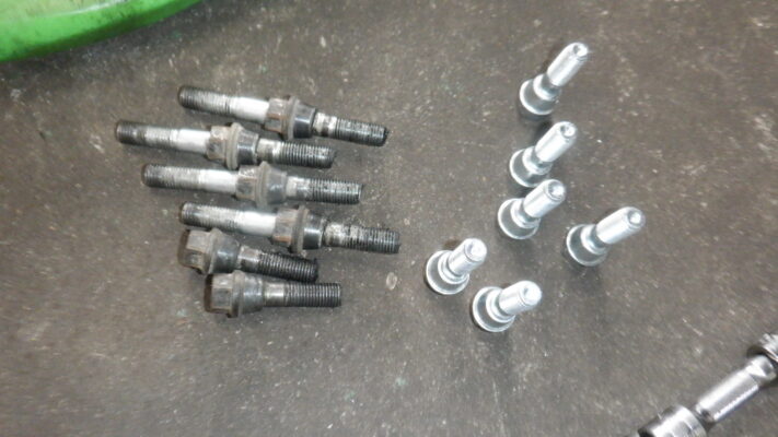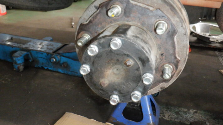 リヤ・ブレーキ点検でアクスルシャフトのボルトが硬くて外れないボルトの頭がボロボロな状態なので交換しました、現在使用しているボルトが廃番で無いのでノーマルボルトに交換するのでホイールカバーが取り付けられなくなります