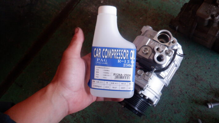 コンプレッサーオイルが入っていない状態なので、取り付け前に注入します。