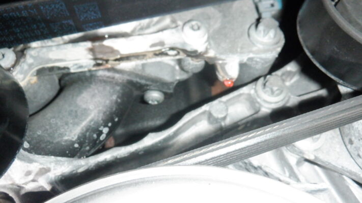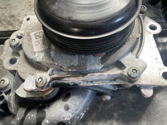 ↑ウォーターポンプは、軸となる中心からの漏れ痕が確認でき、