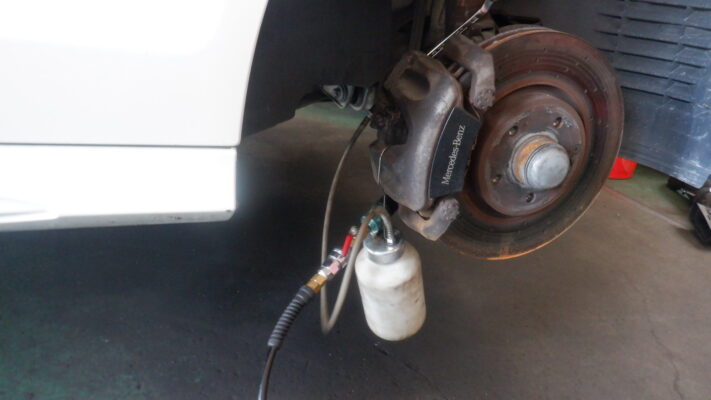 ↑負圧を利用し、各キャリパーからブレーキフルードを抜いて交換。