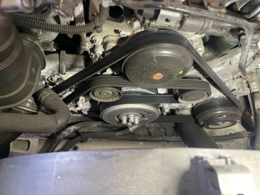 ↑クランクプーリーにも付着痕があり、進行形の漏れです。