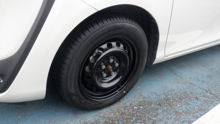 ホイールが曲がってしまい走行不能で入庫です タイヤ4本とホイールを交換しました。 空気圧は2.5に調整しています、100km又は1カ月ほど走行してタイヤがなじんでから、再度空気圧の点検がおすすめです ご来店ありがとうございました。