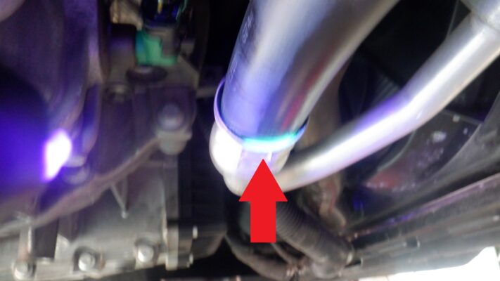 漏れ場所の特定はスムーズでした。ブラックライトで照らすと矢印の所から漏れているのを発見。