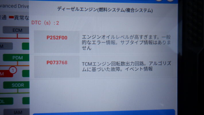 テスターをつないでエラーを読み出すとオイルレベルのエラーが入力されていました。