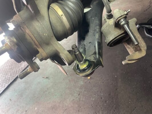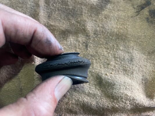 ↑足回りロアボールジョイントブーツの交換。 亀裂が大きいため、