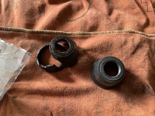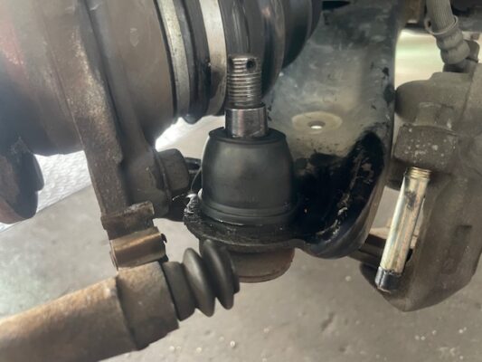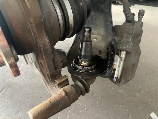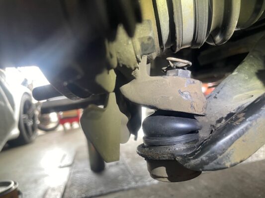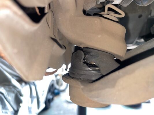 ↑右側ロアボールジョイントブーツ、ブリブリに破れています。