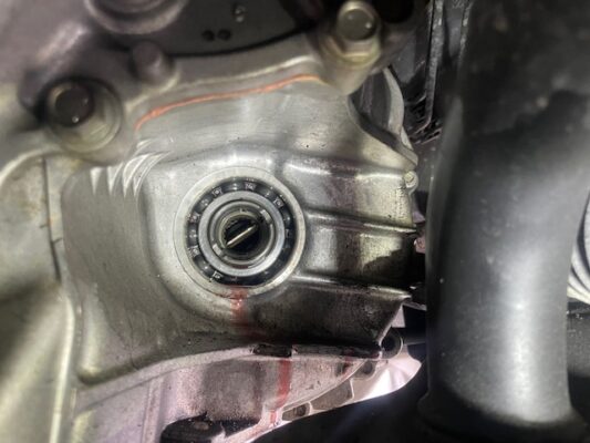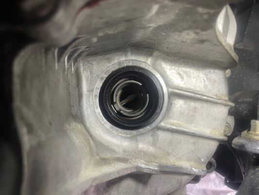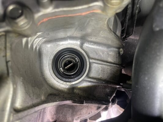 ↑左側のデフサイドシールの交換のため、ドライブシャフトを抜き、