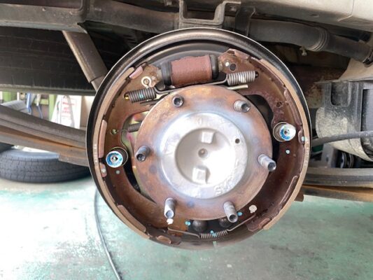 ↑リアもブレーキシュー残量も十分あり、フルードの滲みもありません。
