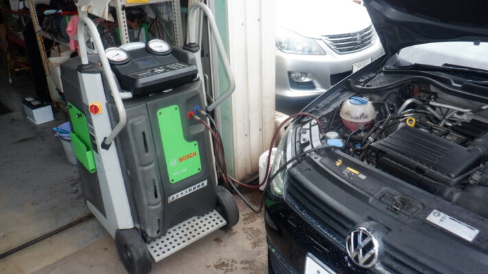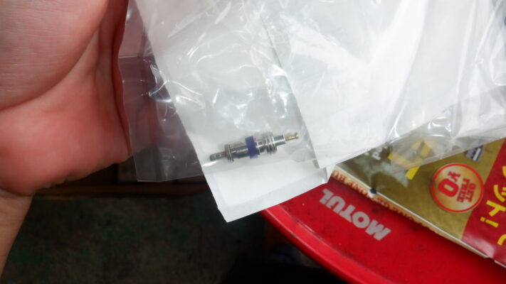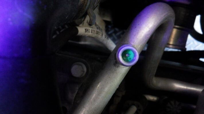 エンジンをかけて様子を見ていると低圧側のサービスカプラーから漏れていました。
