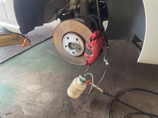 ↑ブレーキフルードの交換。 負圧を利用して各キャリパーより、