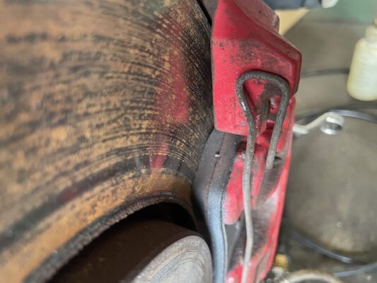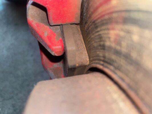 ↑フロントのブレーキパッド残量、7.0mm。