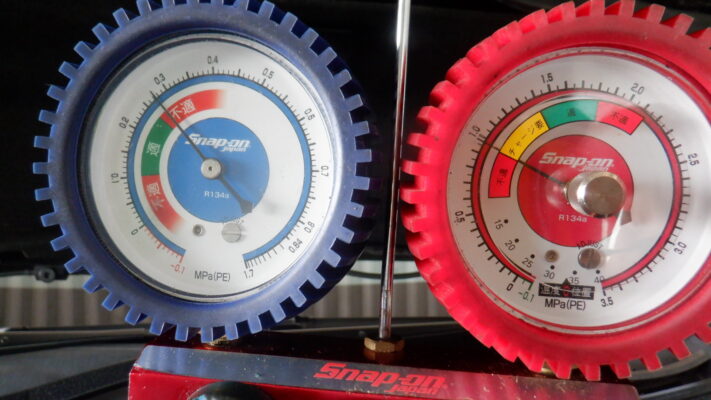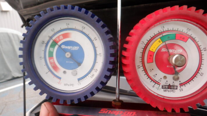 ガス圧を点検すると、高圧側が低いです。