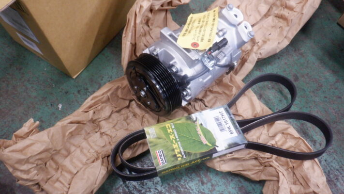 コンプレッサーはリビルト品を使用。ファンベルトも劣化していたので同時交換します。