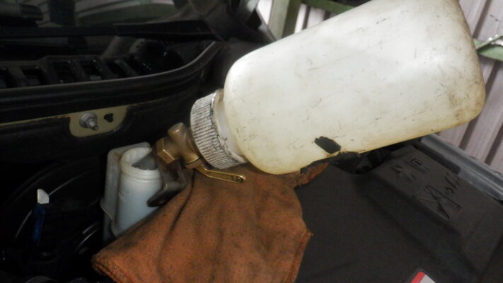 ↑ブレーキフルードの交換。 負圧を利用して各ブレーキキャリパーより、