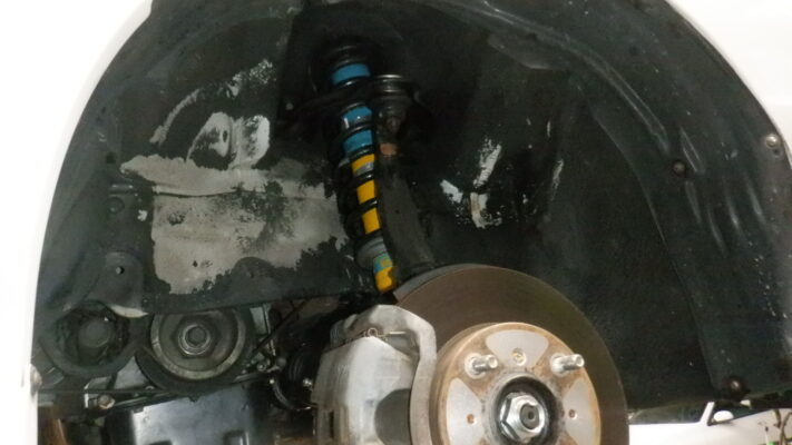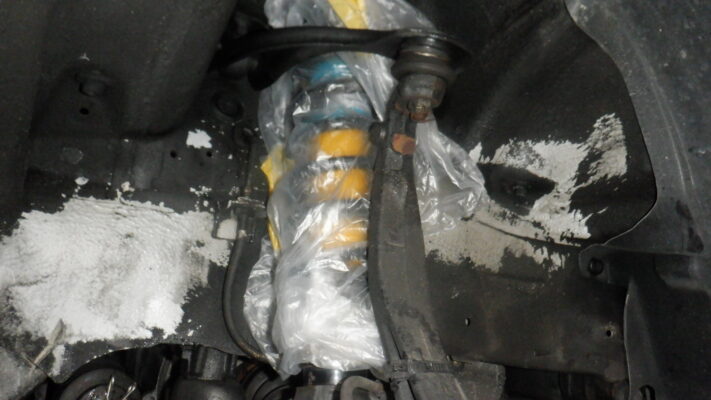 ペイント前にショックは塗装しないので(お客さんのご要望)養生して作業しました。