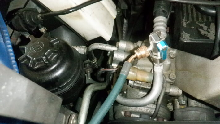 エアコンの前回作業した箇所は漏れなどは無さそうでした、ガスを補充してみると、コンプレッサーに繋がっている配管が別の配管に接触して穴が開いてガス漏れにより冷えなくなってました。