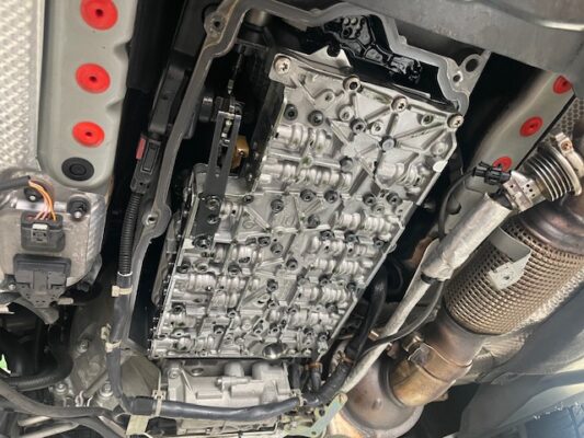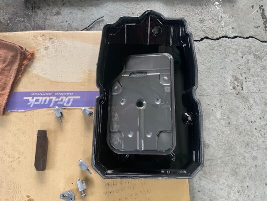 ↑オイルパンをハウジングに規定トルクでボルトを締め付け、フルードを