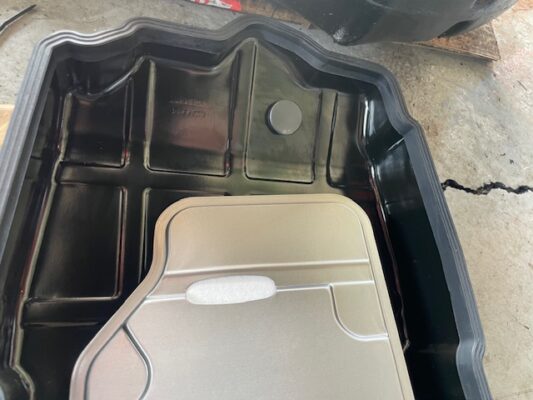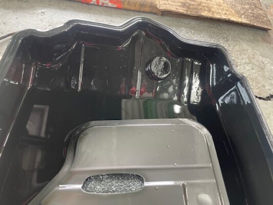 ↑オイルパンを清掃し、オーバーフローパイプを取り付け。
