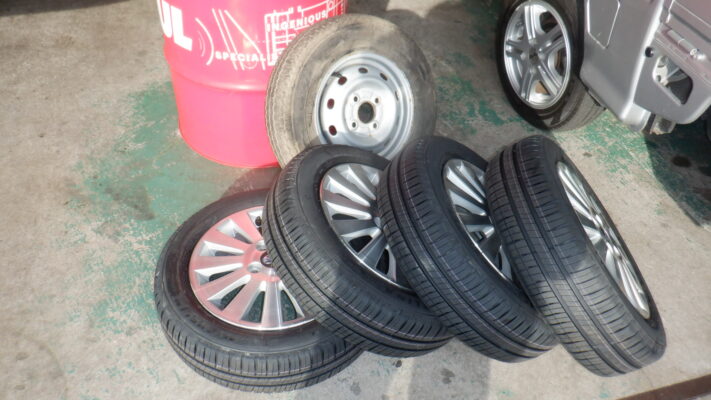 積み込んであるホイールとタイヤを組み付けて