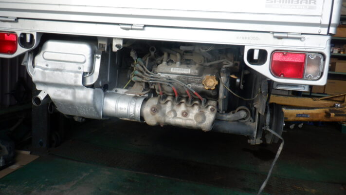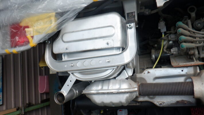 マフラー・遮熱板は出来るだけ取り外して・外せない箇所はネジを緩めて隙間を作りました