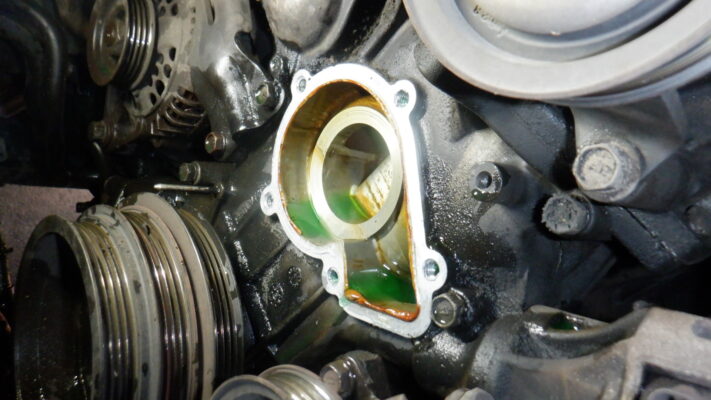 ウォーターポンプを取り外し、軽く力を入れながらコンコンたたけば外れます