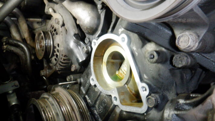周りを清掃して新しいウォーターポンプを液体ガスケットで取り付け